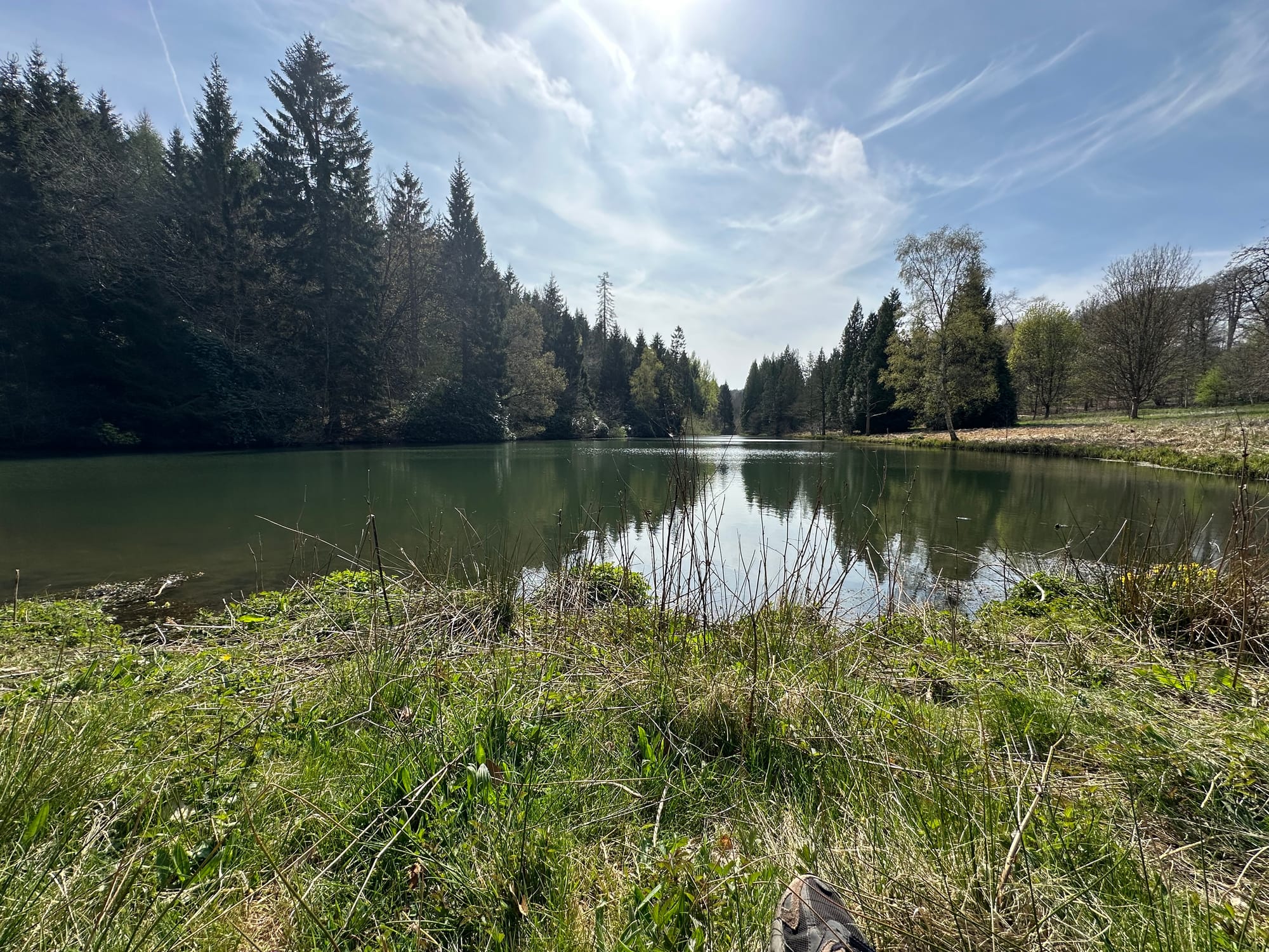 I began to think I should turn around, but then I saw a waterfall. It was several metres high, surrounded by green moss-covered rocks. I climbed up it, and the woods burst open to reveal a lake as flat as glass, reflecting the forest wrapped around it. I sat and listened to the sound of the forest. Birds chirping. Leaves rustling. Water rushing.